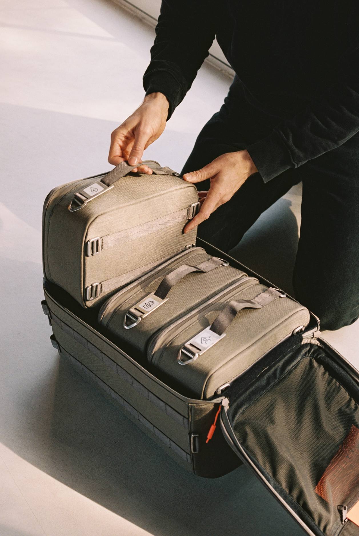 One 30L system bag and three 9-liter capsules (Energy & Light, Water & Health, Personal & Shelter) - all made from 1000D Cordura® with UTX hardware. Plus over 50 curated components, a printed handbook, and component cards for quick reference.